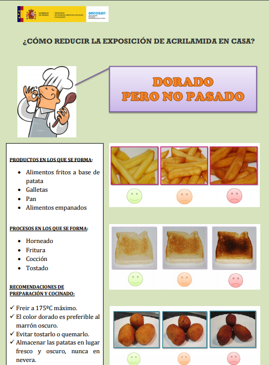 - Venga, que casi están las croquetas chicos. - Mami, pero están muy oscuritas. - Si, no sé qué ha pasado que se han quemado un pelín, pero por dentro están súper ricas...Y no, no me digas que nunca te han quedado las croquetas un poco torradas.O las patatas fritas más morenas de lo normal.O te has visto rallando la tostada que se te ha churruscado mientras hacías el café con un cuchillo.Pues yo vivía en la ignorancia más absoluta hasta que un buen día, mientras esperaba a que me atendieran en la Dirección General de Sanidad y Consumo por un tema de Medicamentos extranjeros, me topé con un tablón de anuncios y un cartel gigantesco con unas croquetas como las mías, y entonces entré en pánico. Hablaba de la Acrilamida. Según la AECOSAN (Agencia española de consumo, seguridad alimentaria y nutrición): "La acrilamida es un compuesto que se forma durante el cocinado de ciertos alimentos sometidos a altas temperaturas (más de 120ºC). Esta reacción química es la misma que ?pardea u oscurece? estos alimentos haciéndolos más sabrosos. Este proceso es susceptible de darse tanto en casa como en restaurantes o en la industria alimentaria. El café, productos fritos a base de patata, las galletas, los crackers, el pan tostado y el pan de molde son importantes fuentes de exposición a acrilamida en la dieta."O sea, todos productos bastante frecuentes en los hogares con niños, aunque los fritos no sean recomendables. Pe...